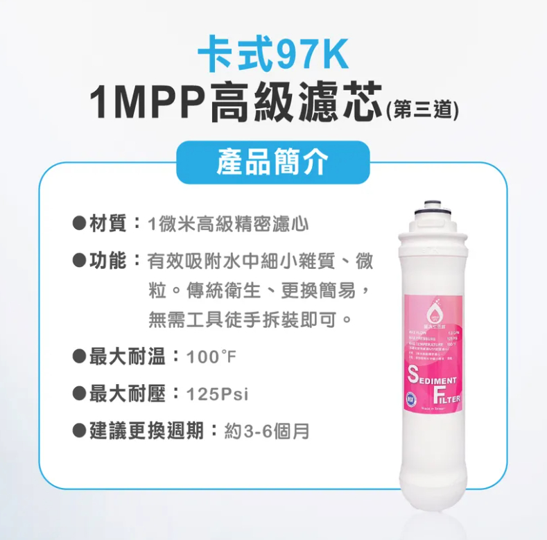 【卡式97K-PP一微米高級精密濾芯】 第三道:1mPP一微米高級精密濾心 功能:有效吸附水中細小雜質、微粒。 最大耐溫:100°F 最大耐壓:125Psi 是拋棄型”較一般傳統衛生”更換更簡易”無需工具”徒手拆裝即可 (適用機種G系列97K過濾器)