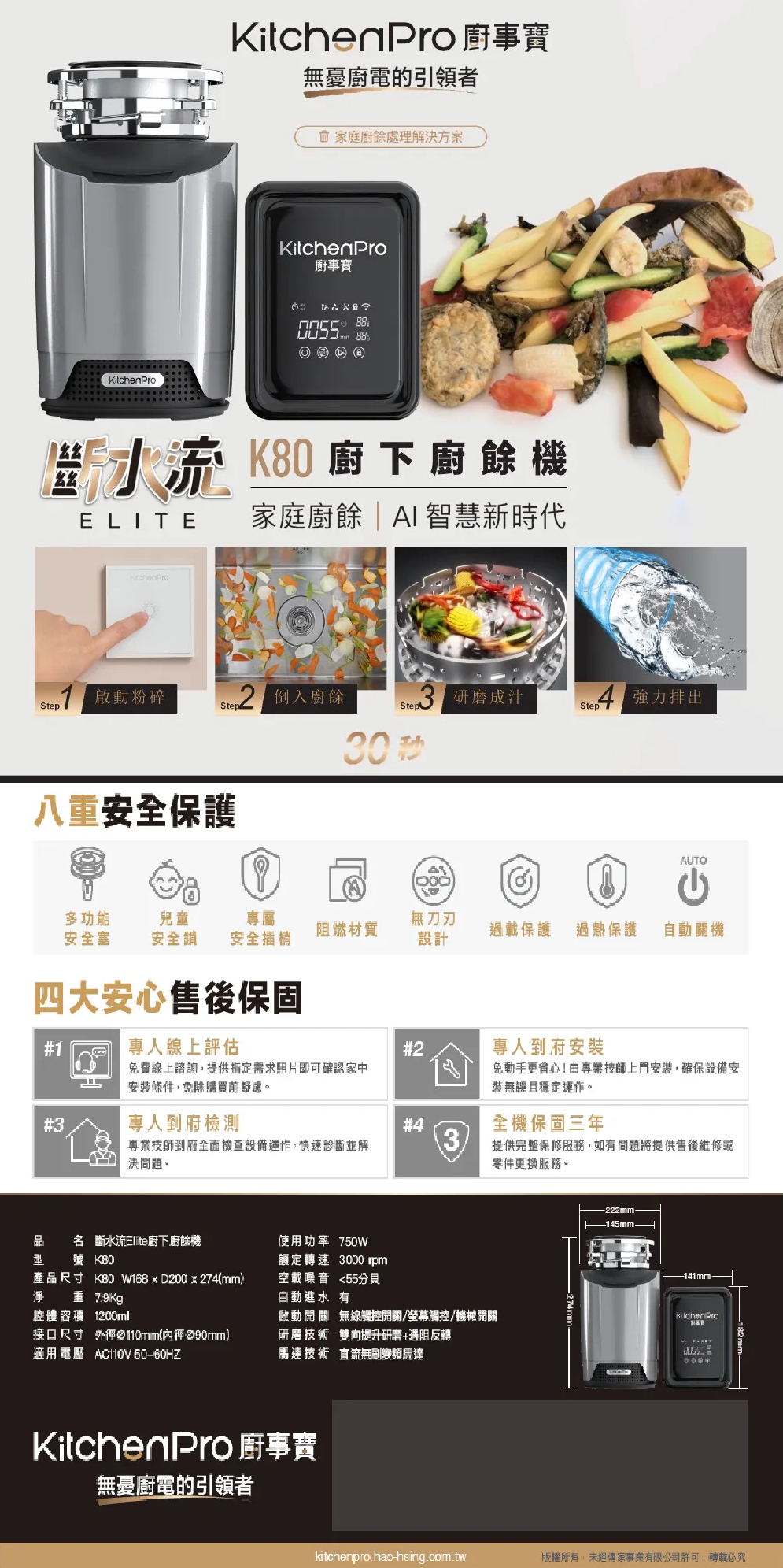 廚事寶 KitchenPro 斷水流 K80 Elite 櫥下式 AI 廚餘處理機 廚餘機