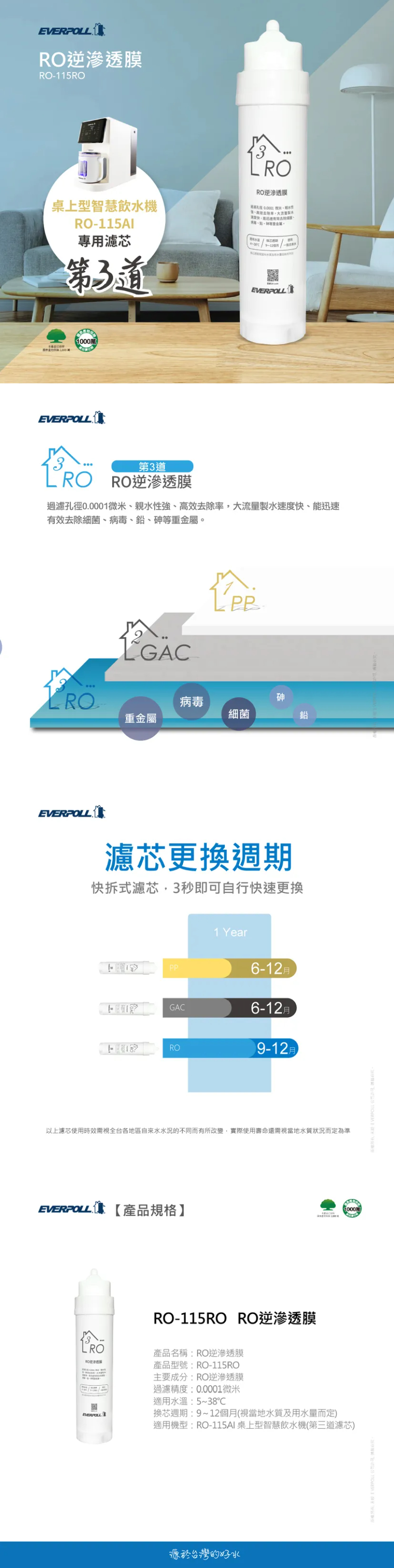 首頁/淨水產品/愛科濾淨 RO-115RO逆滲透膜(第三道)【適用RO-115AI桌上型智慧飲水機】 🔍 愛科濾淨 RO-115RO逆滲透膜(第三道)【適用RO-115AI桌上型智慧飲水機】NT$1,280 RO-115RO逆滲透膜 (第三道) 產品名稱:高效活性碳過濾 產品型號:RO-115RO 主要成分:RO逆滲透膜 過濾精度:0.0001微米 適用水溫:5~38℃ 換芯週期:9~12個月(視當地水質及用水量而定) 適用機型:RO-115AI桌上型智慧飲水機(第三道濾芯) 愛科濾淨 RO-115RO逆滲透膜(第三道)【適用RO-115AI桌上型智慧飲水機】 數量 加入購物車 描述 相關商品 LED-UV滅菌器+全效能淨水組(UVC-902+GS-400 A Plus) NT$19,800 雙效複合式精密濾芯(GS-250 A-Plus) NT$3,100 【EVERPOLL愛科濾淨】桌上型智慧飲水機 RO-115AI NT$13,800 多折式雙效複合濾芯 (R-001) NT$3,500
