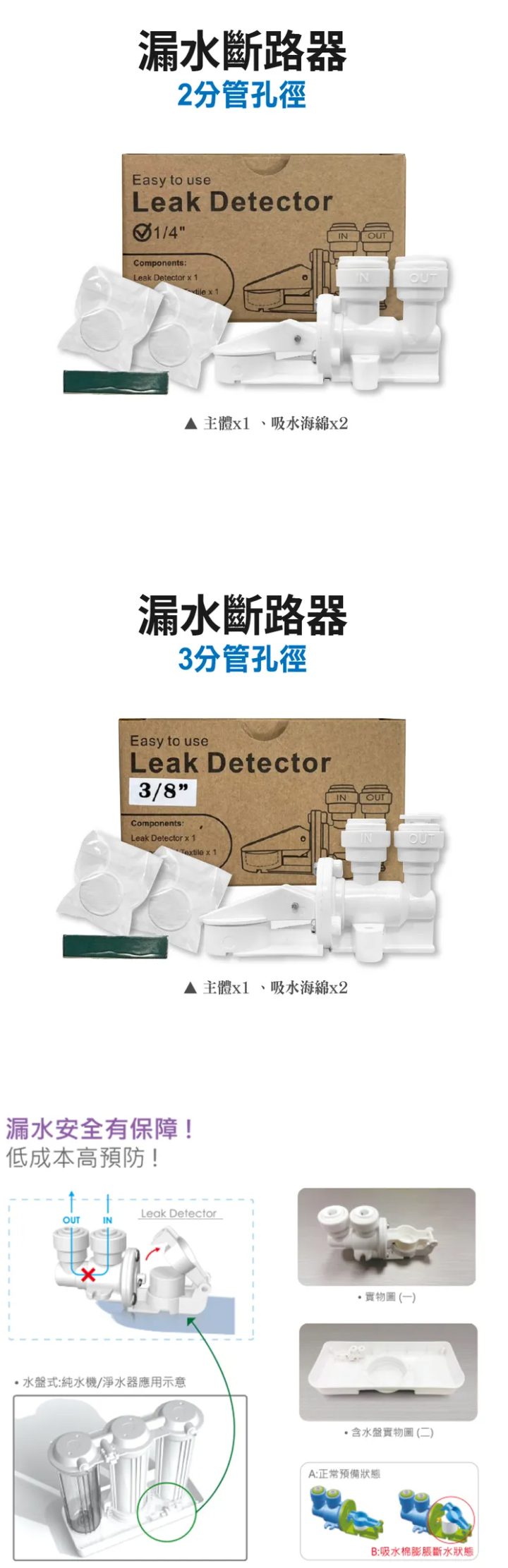 安裝機台進水口,當機器漏水,底部海綿吸水約3~5CC海綿會膨脹斷路器止水閥彈開塞住進水口,阻斷水源避免持續漏水(不需要插電安裝容易)