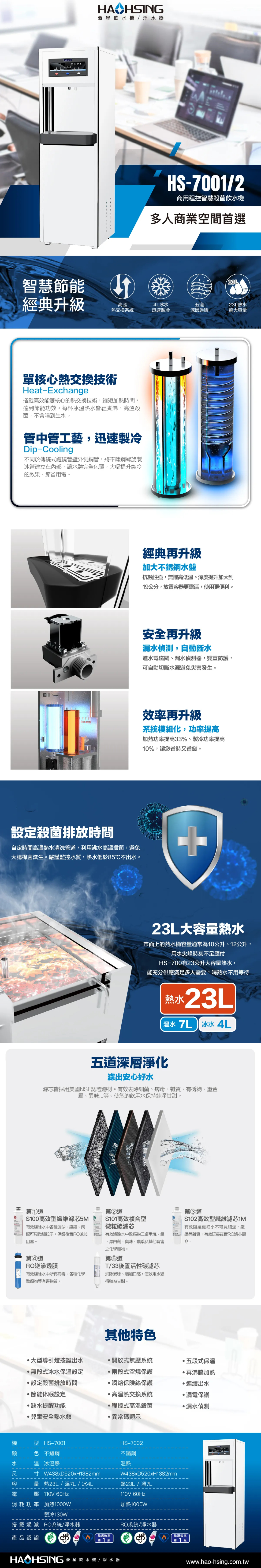 首頁/淨水產品/豪星 HAO-HSING HS-7001 冰溫熱 三溫 程控智慧殺菌飲水機 落地飲水機 🔍 豪星 HAO-HSING HS-7001 冰溫熱 三溫 程控智慧殺菌飲水機 落地飲水機NT$34,800 詳細規格 型號:HS-7001 品名:商用程控智慧殺菌飲水機 顏色:不鏽鋼 水溫:冰溫熱 產品尺寸:W438xD520xH1382(mm) 額定電壓:110V/60Hz 加熱功率:1000W 製冷功率:130W 熱水容量:23L 溫水容量:7L 冰水容量:4L 通用人數:15~25人 搭載過濾:RO系統/淨水器 冷媒克數:40g 豪星 HAO-HSING HS-7001 冰溫熱 三溫 程控智慧殺菌飲水機 落地飲水機 數量 加入購物車 描述 相關商品 美國無鈉離子交換樹脂濾芯(GS-150 A-Plus) NT$3,100 智能活氧10秒機(OH-8800) NT$16,500 全戶濾淨(AHP-150) NT$14,800 LED-UV滅菌器(UVC-902) NT$11,800