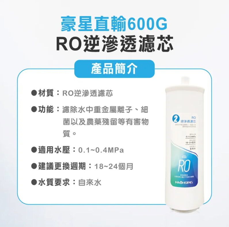 首頁/淨水產品/豪星 HAOHSING 600G直輸RO逆滲透濾芯 🔍 豪星 HAOHSING 600G直輸RO逆滲透濾芯NT$4,900 原始價格:NT$4,900。NT$4,500目前價格:NT$4,500。 豪星 HAOHSING 600G直輸RO逆滲透濾芯 數量 加入購物車 描述 【產品介紹】 功能:濾除水中重金屬離子、細菌以 及農藥殘留等有害物質。 適用水壓:0.1~0.4MPa 建議更換週期:約18-24個月 水質要求:自來水 ※豪星 600G RO直輸機專用濾芯 相關商品 直出式極淨純水設備(RO-900) NT$23,800 AHP-300 專用濾芯(AHP-030) NT$5,800 全戶濾淨(AHP-150) NT$14,800 UV滅菌生飲壺專用濾芯(6入裝) NT$2,160