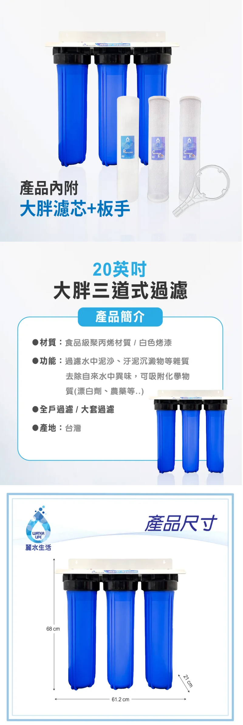 品名:20英吋大胖三道過濾器 適用:頂樓 水塔式過濾、全戶過濾 進出水口:1英吋 尺寸:高 68cm、寬 61.2cm、深21cm 材質:食品級聚丙烯材質/白色烤漆 產地:台灣製造(品質保證) *許多陸製濾殼較薄,易破裂,本商城保證使用台灣製造(絕對耐用) 【濾心】 第一道:20吋大胖PP綿質5 m濾心 1 支 第二道:20吋大胖CTO椰殼活性碳棒 1 支 第三道:20吋大胖CTO椰殼活性碳棒 1 支