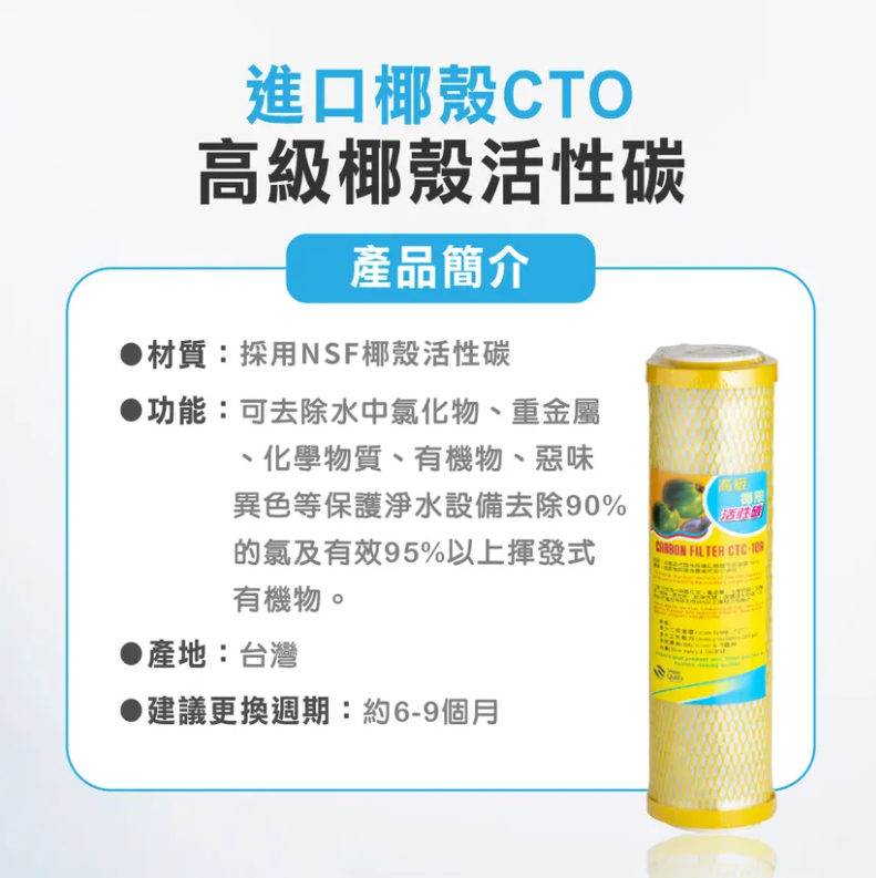 【產品特色】 名稱:高級椰殼柱狀活性碳濾心 材質:採用NSF椰殼活性碳 可去除水中氯化物、重金屬、化學物質、 有機物、惡味、異色等 特性:保護淨水設備去除90%的氯及有效95%以上揮發有機物。 適用:一般傳統通規過濾器、淨水器、簡易二道、三道、五道 產地:台灣製造 建議更換週期:6-9個月