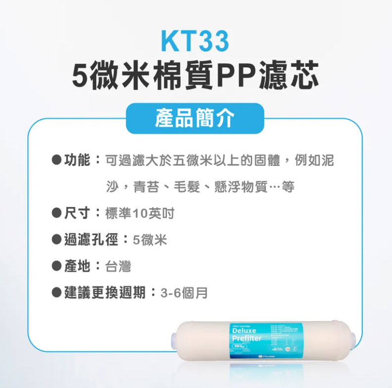首頁/淨水產品/10吋 KT33-5微米棉質PP濾芯 🔍 10吋 KT33-5微米棉質PP濾芯NT$350 10吋 KT33-5微米棉質PP濾芯 數量 加入購物車 描述 【KT33 5微米棉質PP濾心】 功能:過濾大於5微米以上之固體,例如泥沙, 青苔、毛髮、懸浮物質…等等。 適用:各式淨水器 尺寸:標準10英吋 水源:自來水 建議更換週期:3-6個月 相關商品 直出式極淨純水設備(RO-900) NT$23,800 AHP-300 專用濾芯(AHP-030) NT$5,800 廚下型雙溫UV觸控飲水機(GS-288) NT$34,000 純淨沐浴器專用濾芯(GS-680F) NT$2,950