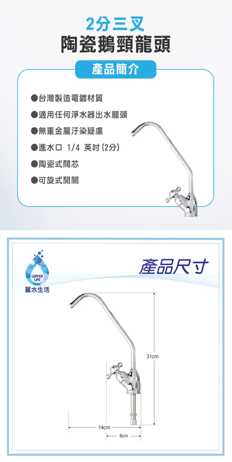 【2分三叉陶瓷鵝頸龍頭】 尺寸: 長31cm x 寬14cm (寬至出水口距離) 規格: 1/4英吋(2分規格) 產地: 台灣 適用: RO純水機、一般淨水器、2分PE管進水口 (其他出水) 台灣製造電鍍材質 適用任何淨水器出水龍頭 無重金屬汙染疑慮 進水口1/4英吋(2分) 陶瓷式閥芯 可旋式開關