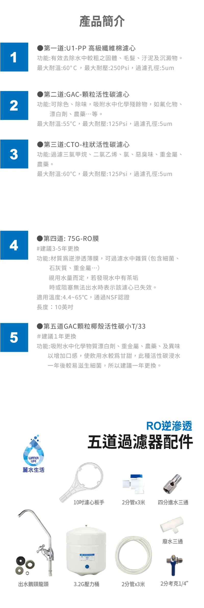 首頁/淨水產品/G7K-05傳統式RO5道過濾器 🔍 G7K-05傳統式RO5道過濾器NT$4,800 G7K-05傳統式RO5道過濾器 數量 加入購物車 描述 【商品特色】 保證100%台灣製造認證濾心 通過[NSF國際認證]、[SGS水質檢測]及[WQA水質協會認證]、 符合國家飲用水標準,所有配件、零件都是嚴格挑選。 有效去除99.999%水中有害物質 使飲用水更加的安全、健康、衛生。 採用電磁閥控制水源,非傳統壓力四角閥,馬達負荷小,降低故障率 使用高低壓開關,自動控制,停水斷電功能,讓您更安心的使用。 #本產品包含所有安裝零件,配件、說明書。 【商品規格】 尺寸:長36.5寬20高47CM。 產地:台灣。 水源出處:自來水。 相關商品 直出RO淨水器(RO-600)+雙出水龍頭 NT$17,100 智能活氧10秒機(OH-8800) NT$16,500 FH-500專用濾芯(FH-050) NT$7,000 RO逆滲透膜(R-RO) NT$3,800