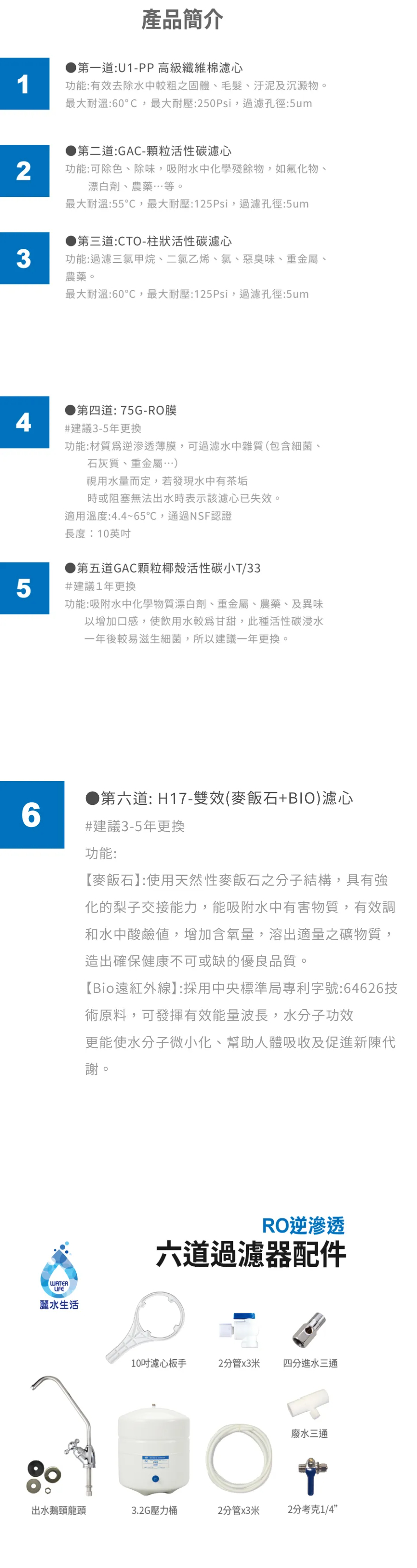 首頁/淨水產品/G8K-06傳統式RO6道過濾器 🔍 G8K-06傳統式RO6道過濾器NT$5,100 G8K-06傳統式RO6道過濾器 數量 加入購物車 描述 【商品特色】 保證100%台灣製造認證濾心 通過[NSF國際認證]、[SGS水質檢測]及[WQA水質協會認證]、 符合國家飲用水標準,所有配件、零件都是嚴格挑選。 有效去除99.999%水中有害物質 使飲用水更加的安全、健康、衛生。 採用電磁閥控制水源,非傳統壓力四角閥,馬達負荷小,降低故障率 使用高低壓開關,自動控制,停水斷電功能,讓您更安心的使用。 #本產品包含所有安裝零件,配件、說明書。 【商品規格】 尺寸:長36.5寬20高47CM。 產地:台灣。 水源出處:自來水。 相關商品 LED-UV滅菌器(UVC-902) NT$11,800 智能活氧10秒機(OH-8800) NT$16,500 FH-500專用濾芯(FH-050) NT$7,000 LED-UV滅菌器+全效能淨水組(UVC-902+GS-400 A Plus) NT$19,800