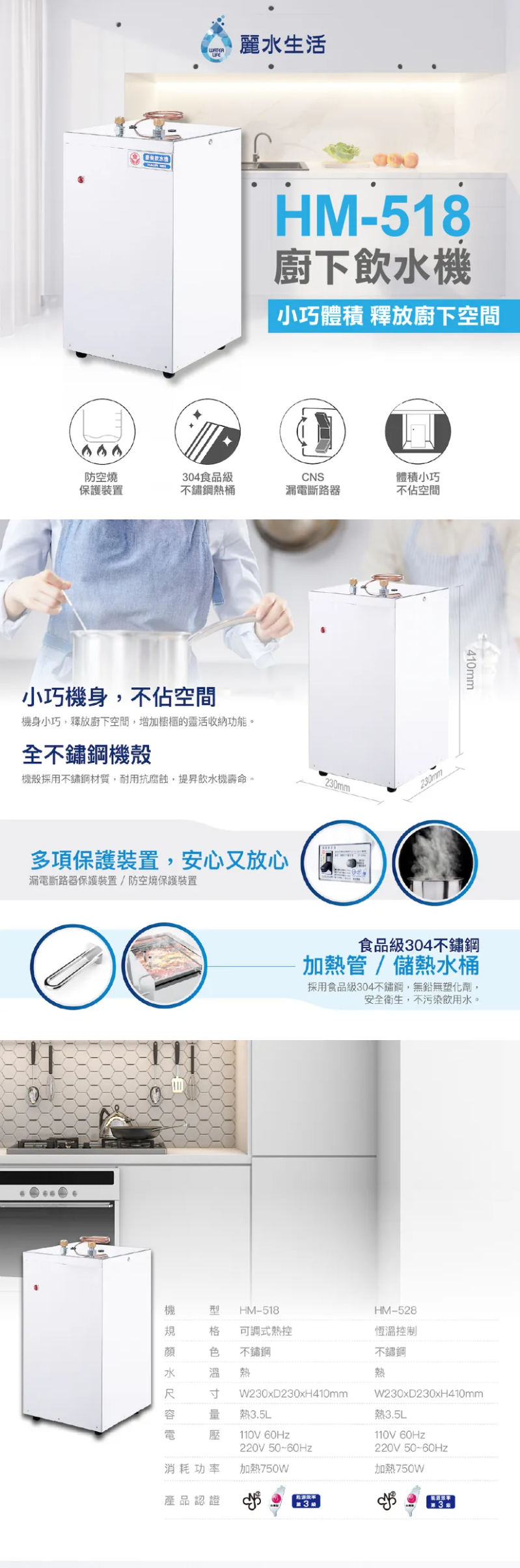 【HM-518廚下型加熱器-調熱控(冷熱雙溫)】 容量:熱水3.5公升 電壓:110V / 60Hz 220V / 50~60Hz 尺寸:寬23cm x 深23cm x 高41cm 消耗功率:加熱750W 適用各種過濾設備 【HM-528廚下型加熱器-壓力式(冷熱雙溫)】 容量:熱水3.5公升 電壓:110V / 60Hz 220V / 50~60Hz 尺寸:寬23cm x 深23cm x 高41cm 消耗功率:加熱750W 適用各種過濾設備