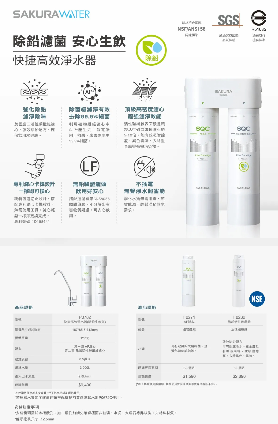首頁/淨水產品/SAKURA 櫻花 P0782 快捷高效淨水器 (除鉛生飲型)