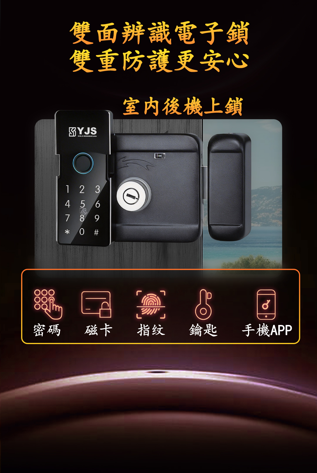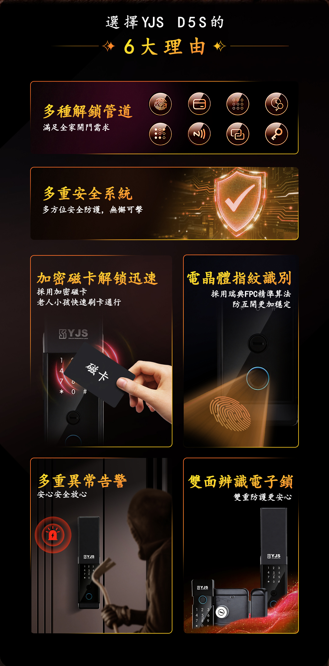 首頁/品牌電子鎖/YJS/YJS D5S雙面辨識防水電子鎖 🔍 YJS D5S雙面辨識防水電子鎖 台灣YJS D5S 雙面辨識防水電子鎖 解鎖方式: 指紋:100組 密碼:100組 卡片:100組 鑰匙:2把 藍芽:10組 遠端 (WIFI解鎖)加購 工作品集 描述 相關商品 YJS R5 房門六合一電子鎖 NT$14,500 YJS F3人臉電子鎖 NT$25,500 YJS S1 人臉電子鎖 NT$33,500 YJS P1 人臉電子鎖 NT$32,500