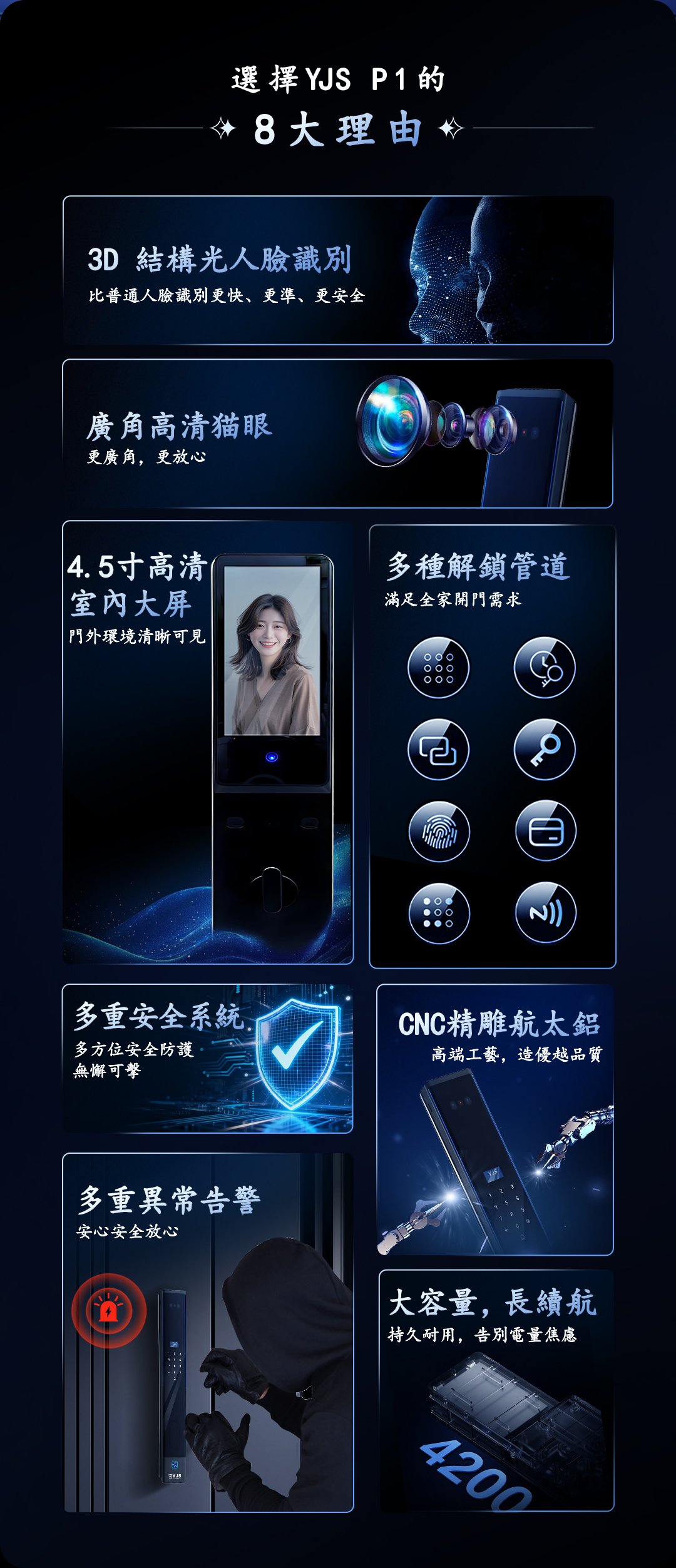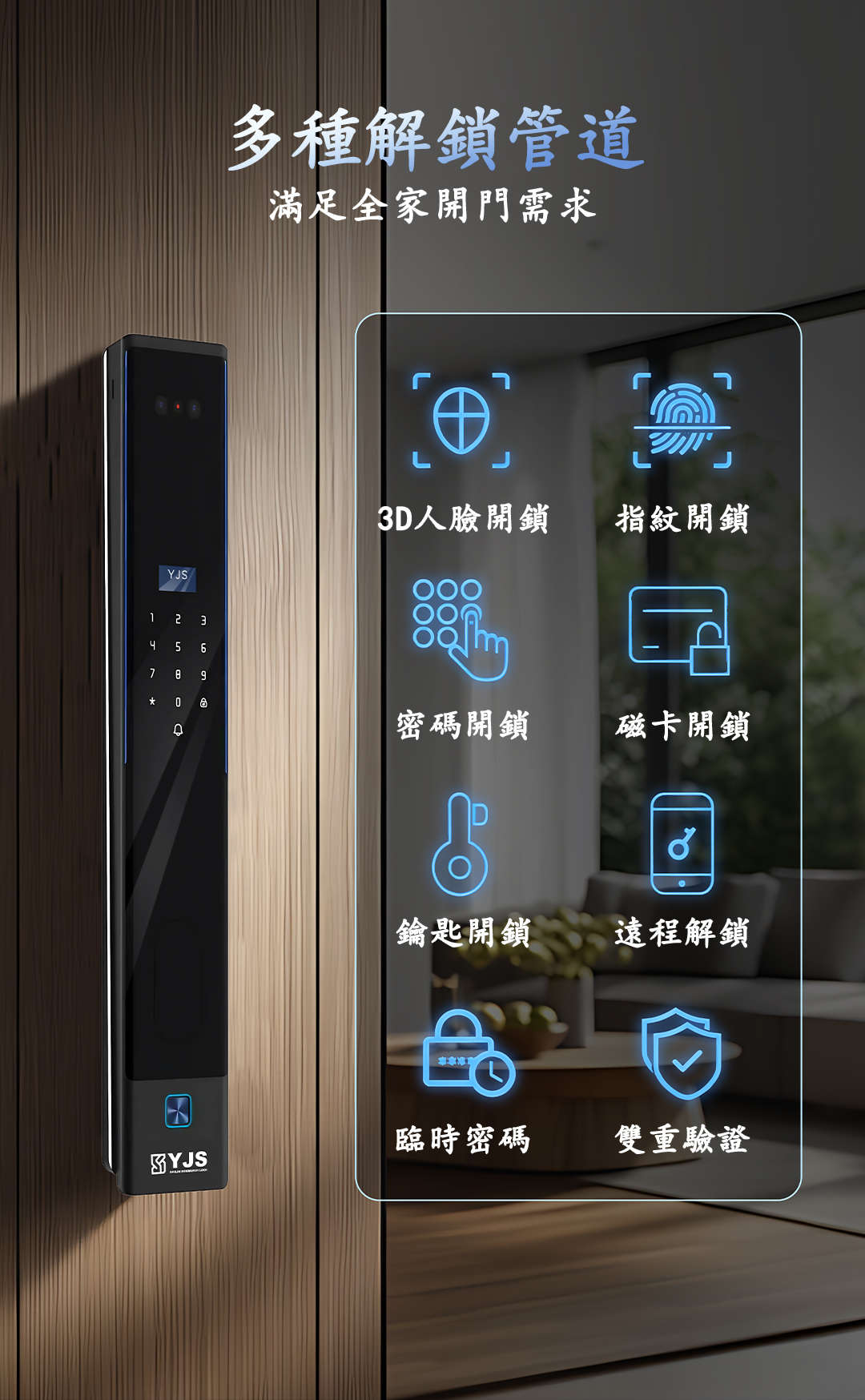 首頁/智慧電子鎖/大組(推拉)把手式電子鎖/YJS P1 人臉電子鎖 🔍 YJS P1 人臉電子鎖NT$32,500 YJS W1(外部防水) 功能: 人臉-掌靜脈-指紋-密碼-卡片-鑰匙-門鈴-貓眼-視訊-遠端-WIFI 解鎖方式: 人臉:100組 掌紋:100組 指紋:100組 密碼:100組 卡片:100組 鑰匙:2把 手機:20組 遠端:(WIFI解鎖) 描述 相關商品 YJS S1 人臉電子鎖 NT$33,500 YJS H2 NT$16,500 YJS Z1 NT$19,500 YJS T1 人臉電子鎖 NT$29,500