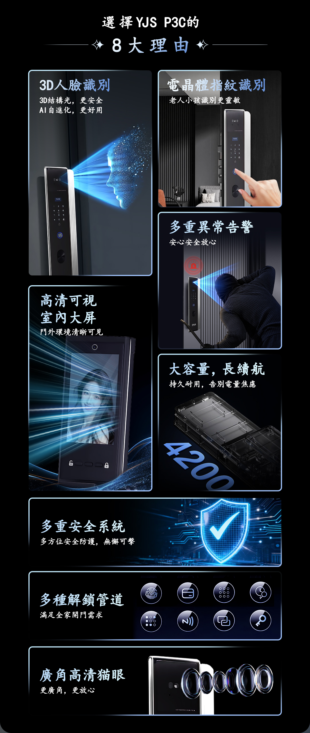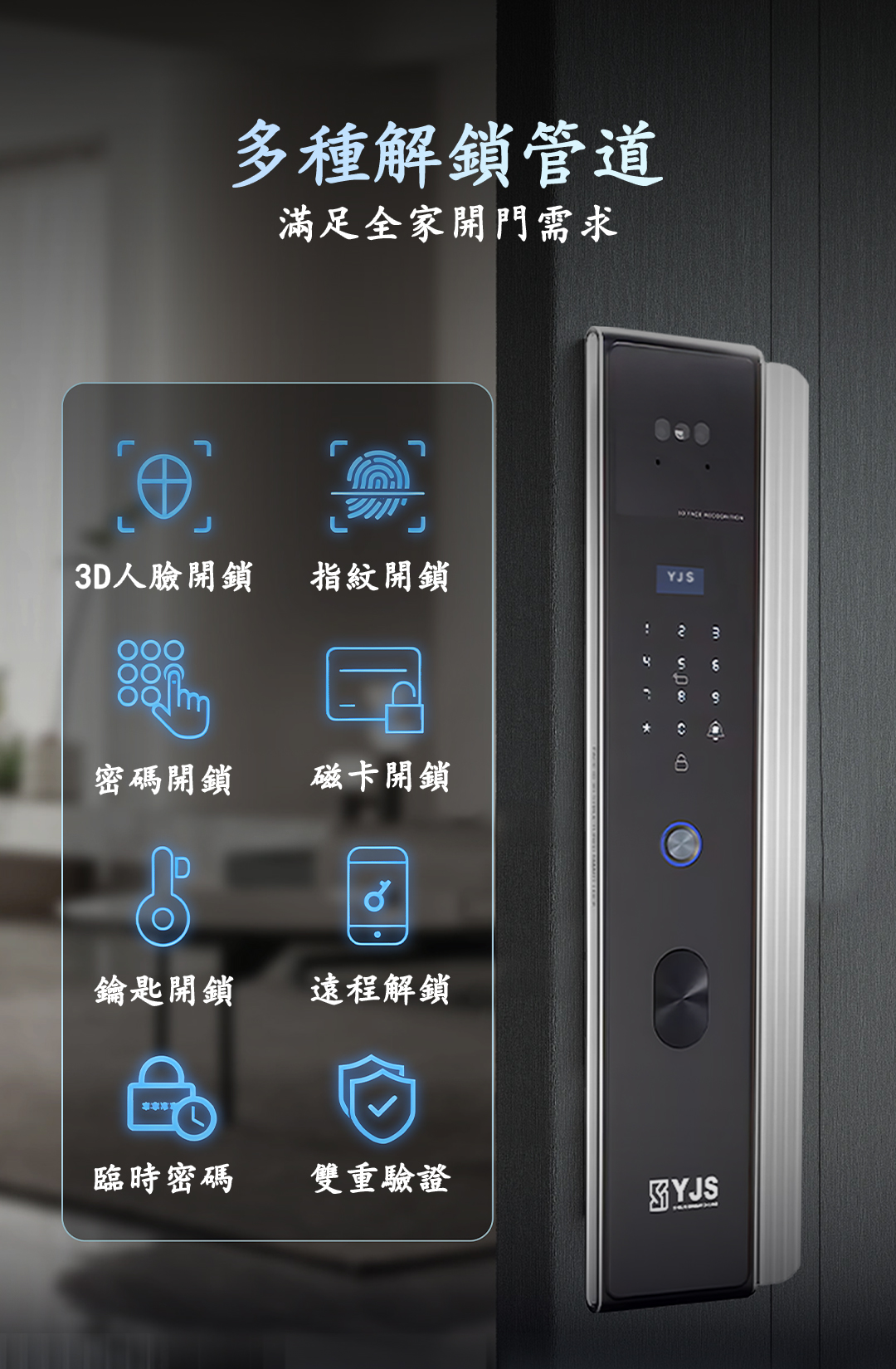 首頁/品牌電子鎖/YJS/YJS P3C 人臉雙攝電子鎖 🔍 YJS P3C 人臉雙攝電子鎖NT$37,500 YJS P3C 人臉雙攝電子鎖(外部防水) 功能: 人臉-掌靜脈-指紋-密碼-卡片-鑰匙-門鈴-貓眼-雙攝貓眼-視訊-遠端-WIFI 解鎖方式: 人臉:100組 掌紋:100組 指紋:100組 密碼:100組 卡片:100組 鑰匙:2把 手機:20組 遠端:(WIFI解鎖) 描述 相關商品 VOC X8+(貓眼) NT$25,500 YJS S1 人臉雙攝電子鎖 NT$36,500 YJS F3 NT$25,500 VOC RS-F NT$25,500
