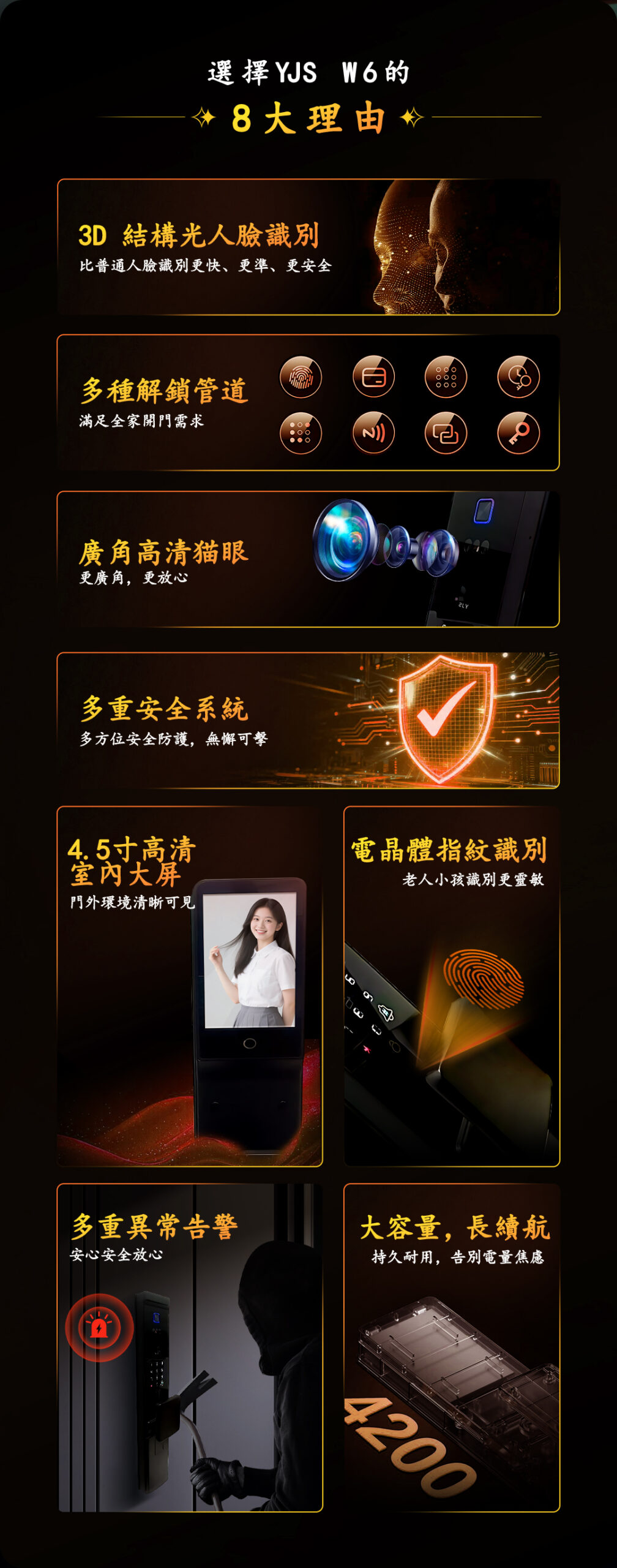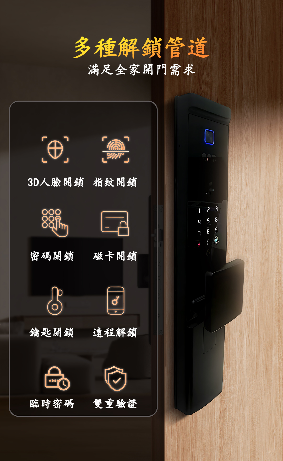 首頁/品牌電子鎖/YJS/YJS W6 人臉電子鎖 🔍 YJS W6 人臉電子鎖NT$30,500 YJS W6 人臉電子鎖(雙面防水) 功能: 人臉-掌靜脈-指紋-密碼-卡片-鑰匙-門鈴-貓眼-視訊-遠端-WIFI 解鎖方式: 人臉:100組 掌紋:100組 指紋:100組 密碼:100組 卡片:100組 鑰匙:2把 手機:20組 遠端:(WIFI解鎖) 描述 相關商品 YJS H2 NT$16,500 YJS W3C 人臉雙攝電子鎖 NT$31,500 YJS S1 人臉電子鎖 NT$33,500 VOC RS-F NT$25,500
